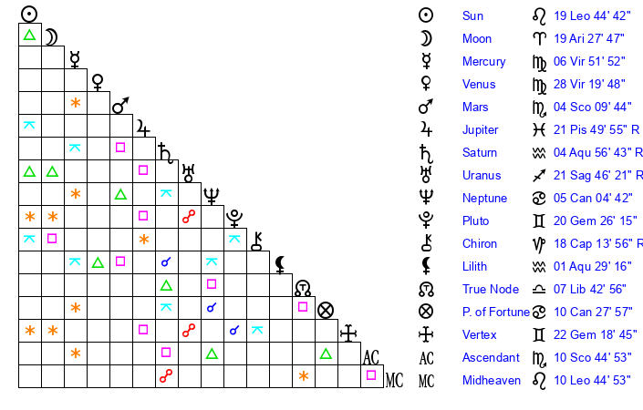 | Sun | 19 Leo 44 | 21 Leo 12 | 20 Sagittarius 31 |