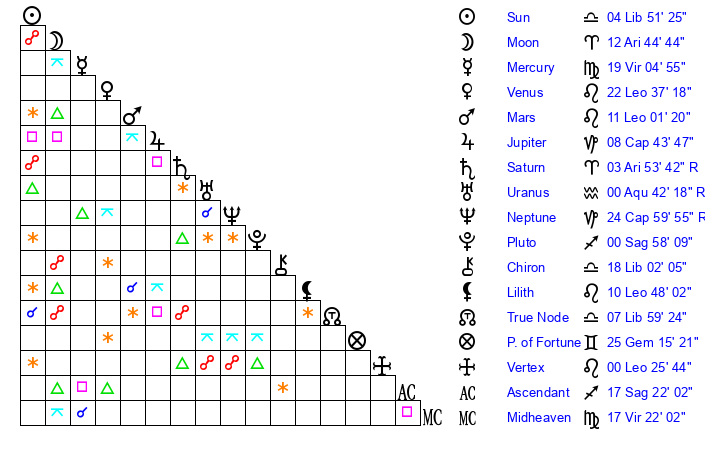 Sun | 4 Libra 51 | 4 Libra 50 | 3 Scorpio 33 |