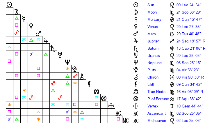 | Neptune | 6 Scorpio 24 | 1 Aries 57 | 7 Scorpio 53 |