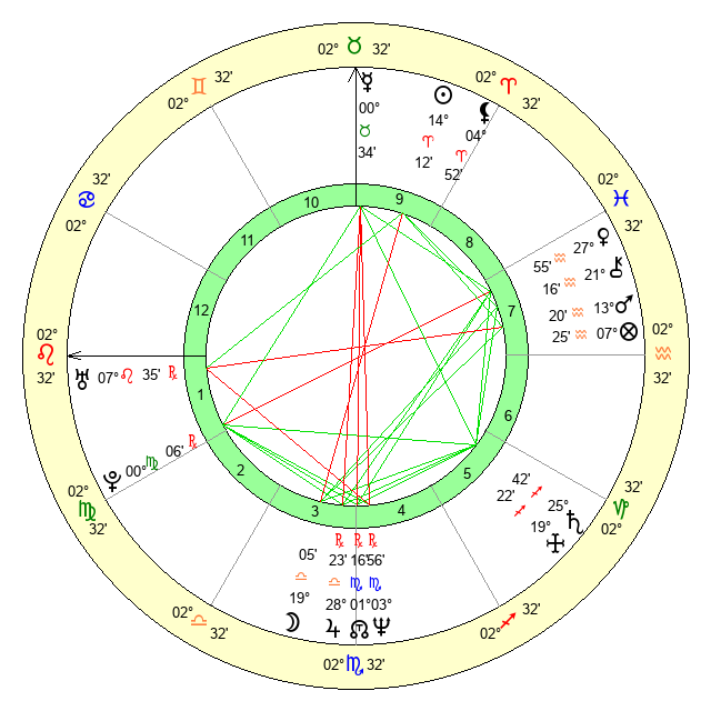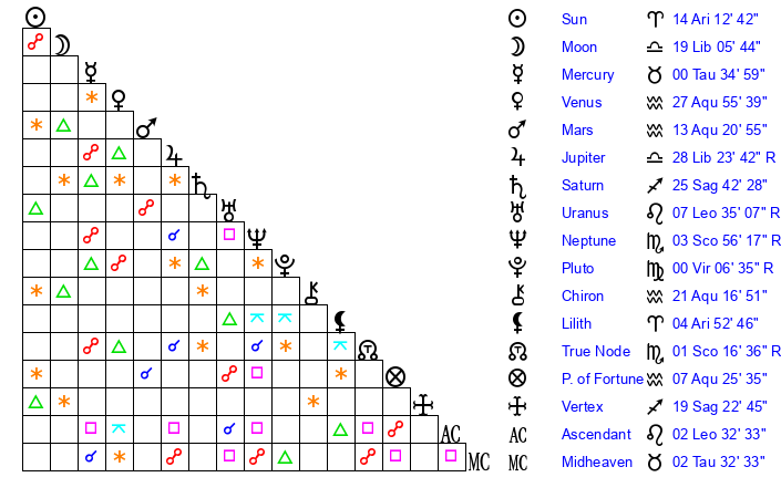 | Moon | 19 Libra 7 | 7 Cancer 36 | 2 Aries 16 |