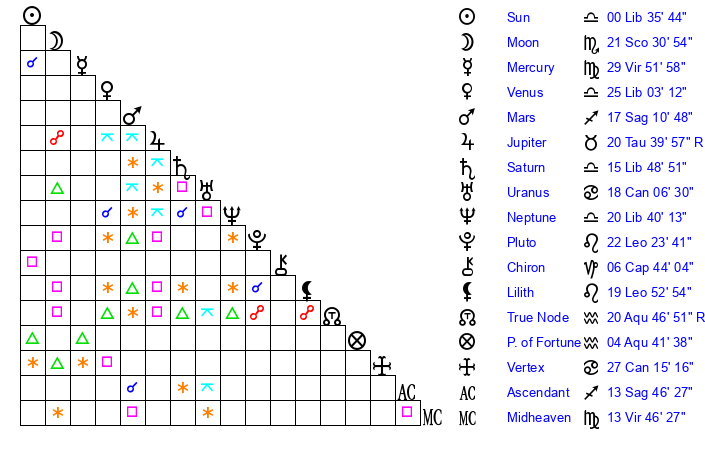 | Sun | 0 Libra 36 | 0 Libra 55 | 13 Sagittarius 31 |