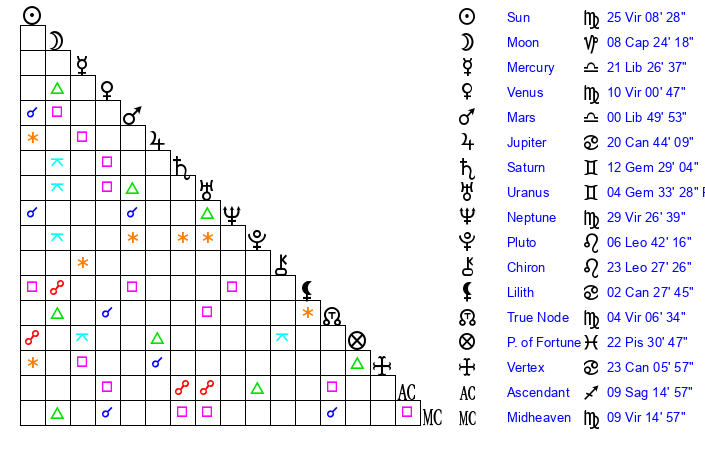 | Sun | 25 Virgo 8 | 26 Virgo 2 | 18 Sagittarius 1 |