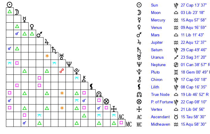 | Moon | 3 Libra 18 | 22 Virgo 4 | 7 Pisces 40 |