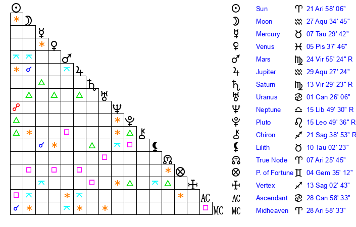 | Moon | 27 Aquarius 32 | 16 Libra 38 | 17 Scorpio 29 |