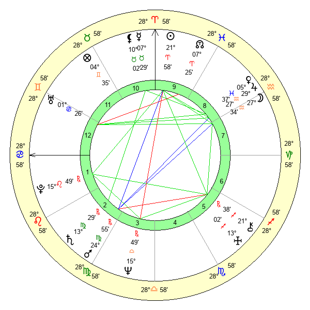| Sun | 21 Aries 58 | 22 Aries 47 | 4 Cancer 16 |