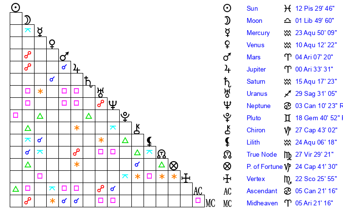 | Neptune | 3 Cancer 11 | 28 Pisces 59 | 5 Cancer 50 |