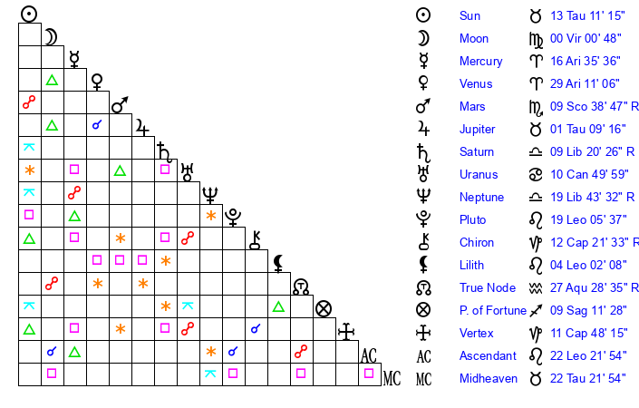 | Sun | 13 Taurus 11 | 13 Taurus 30 | 23 Cancer 7 |