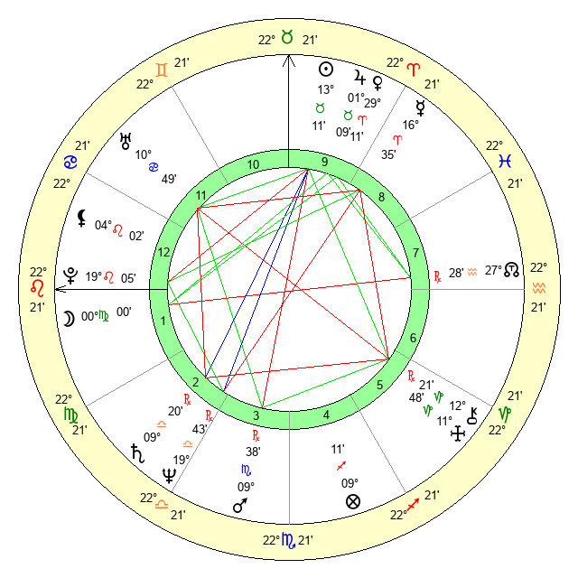 | Moon | 29 Leo 54 | 3 Leo 9 | 12 Taurus 8 |
