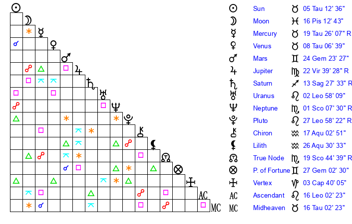 | Venus | 8 Taurus 7 | 27 Pisces 32 | 1 Leo 32 |