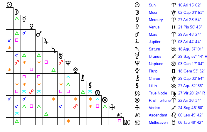 | Sun | 16 Aries 15 | 16 Aries 56 | 12 Leo 35 |