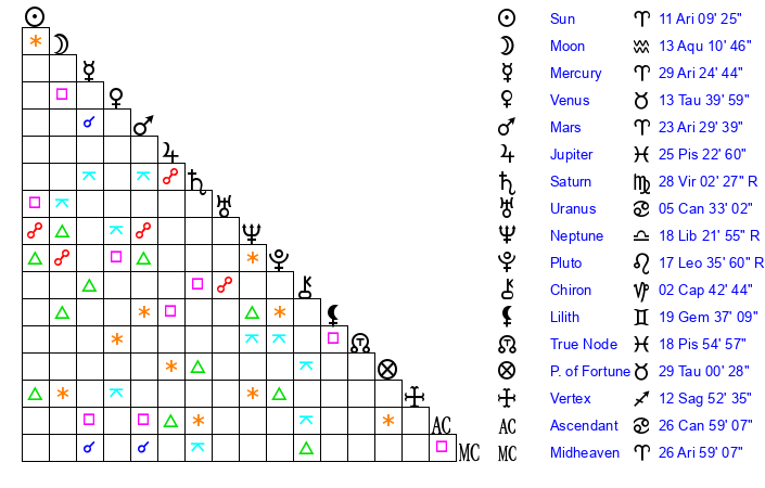| Moon | 13 Aquarius 11 | 27 Taurus 52 | 16 Libra 25 |