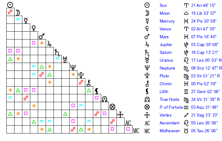 | Moon | 19 Libra 56 | 7 Libra 43 | 18 Pisces 38 |