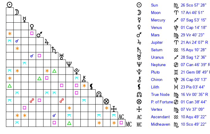 | Moon | 17 Aries 50 | 21 Scorpio 22 | 22 Virgo 26 |