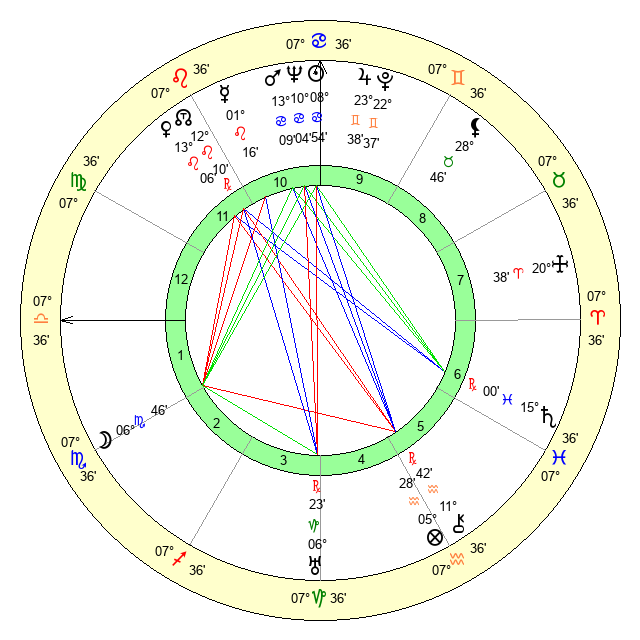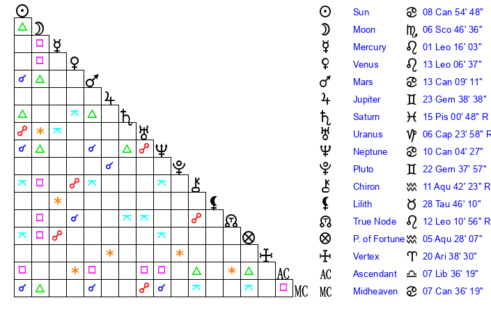 | Sun | 8 Cancer 55 | 10 Cancer 6 | 4 Scorpio 22 |