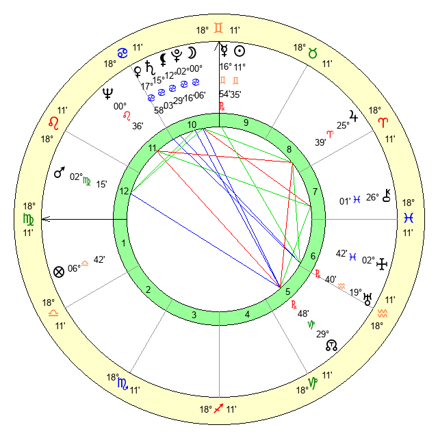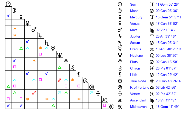 | Moon | 0 Cancer 3 | 4 Virgo 50 | 29 Gemini 16 |