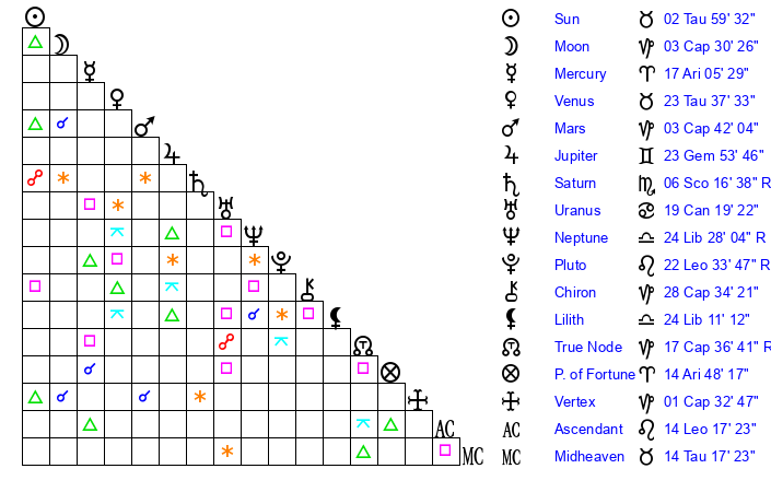 | Venus | 23 Taurus 38 | 26 Pisces 44 | 18 Leo 48 |