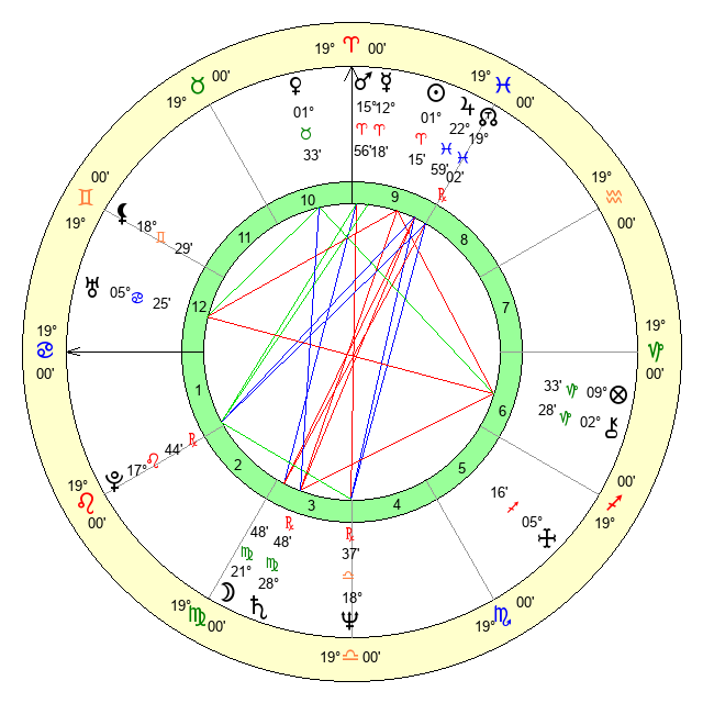 | Mars | 15 Aries 56 | 20 Cancer 51 | 9 Gemini 54 |