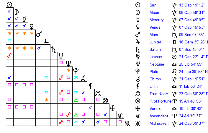 | Moon | 8 Capricorn 59 | 14 Pisces 47 | 24 Leo 6 |