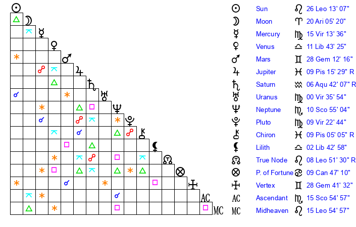 | Moon | 19 Aries 58 | 12 Cancer 33 | 13 Leo 10 |