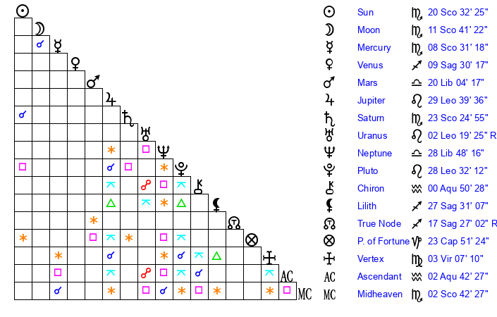 | Sun | 20 Scorpio 32 | 21 Scorpio 34 | 1 Aquarius 39 |