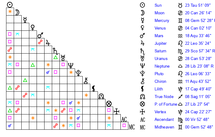 | Moon | 20 Cancer 29 | 16 Sagittarius 18 | 27 Capricorn 47 |