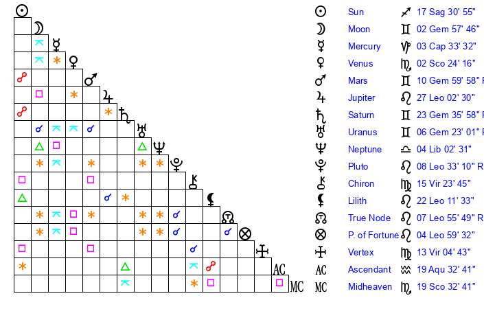 | Sun | 17 Sagittarius 31 | 18 Sagittarius 53 | 9 Pisces 45 |