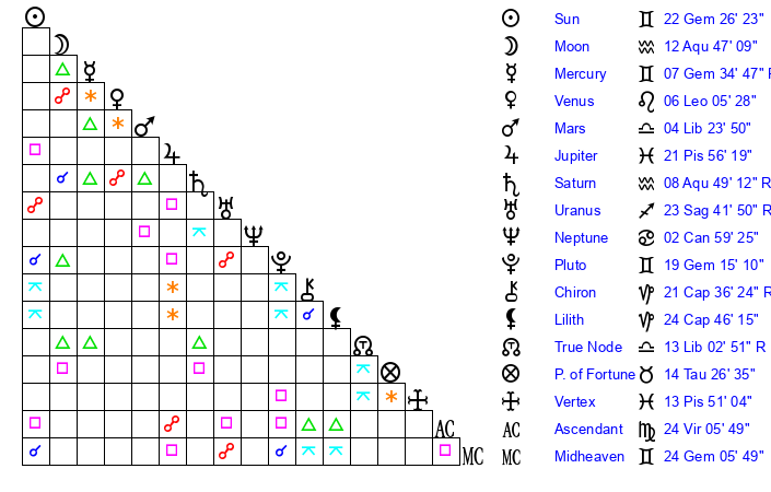 | Pluto | 19 Gemini 16 | 3 Aquarius 26 | 20 Gemini 37 |