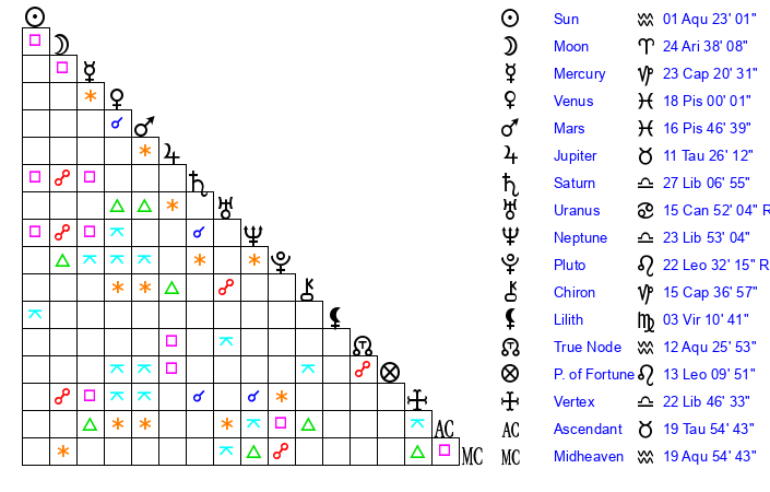 | Moon | 24 Aries 36 | 0 Scorpio 12 | 1 Sagittarius 5 |