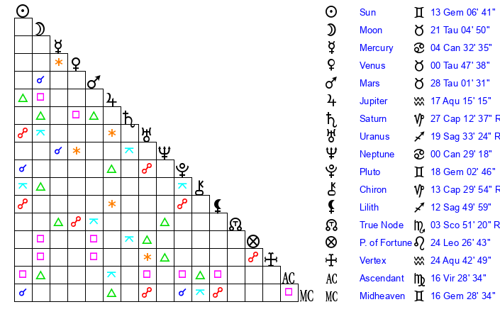 | Jupiter | 16 Aquarius 56 | 28 Gemini 50 | 7 Aquarius 6 |