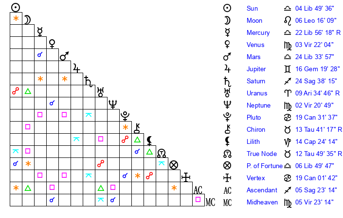 | Mercury | 22 Libra 56 | 17 Libra 6 | 0 Aquarius 2 |