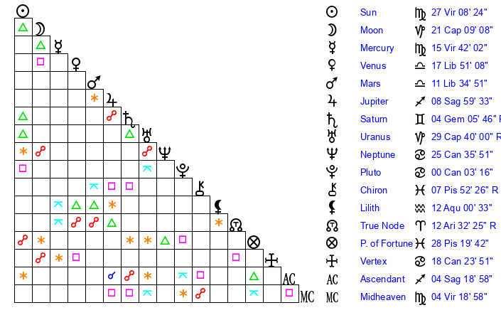 | Sun | 27 Virgo 8 | 27 Virgo 47 | 20 Capricorn 41 |