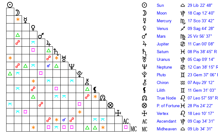 | Saturn | 29 Aquarius 46 | 26 Pisces 7 | 13 Pisces 0 |