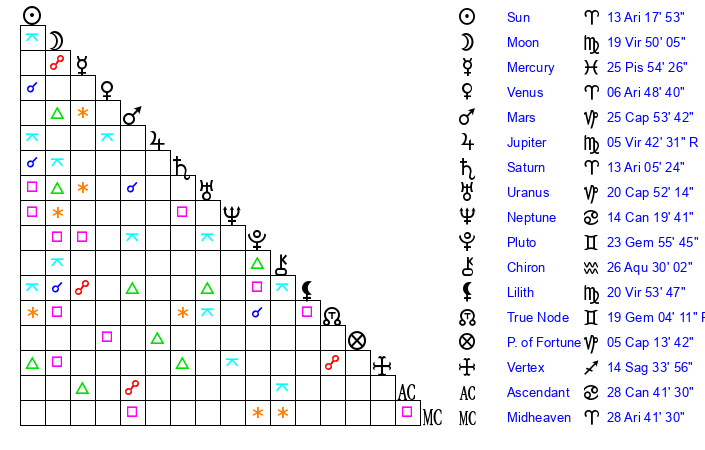 | Moon | 19 Virgo 47 | 26 Gemini 40 | 11 Sagittarius 37 |