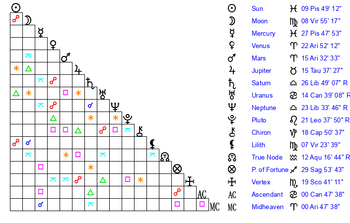 | Moon | 8 Virgo 52 | 19 Pisces 32 | 0 Taurus 31 |