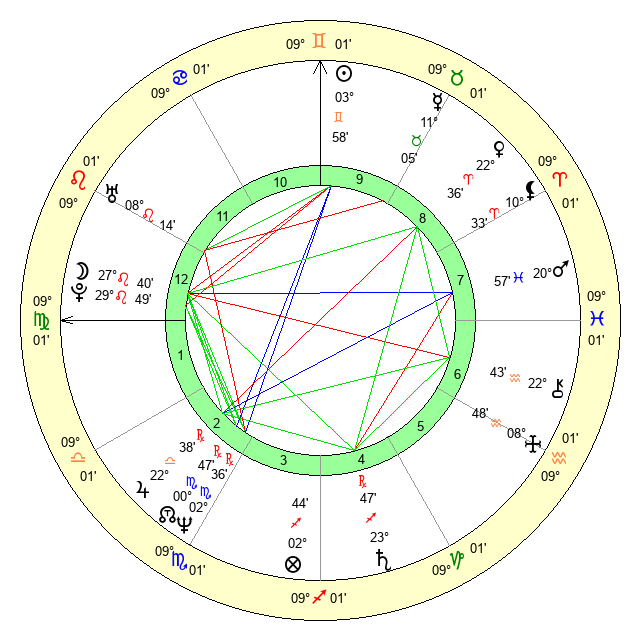 | Sun | 3 Gemini 58 | 4 Gemini 44 | 7 Leo 58 |