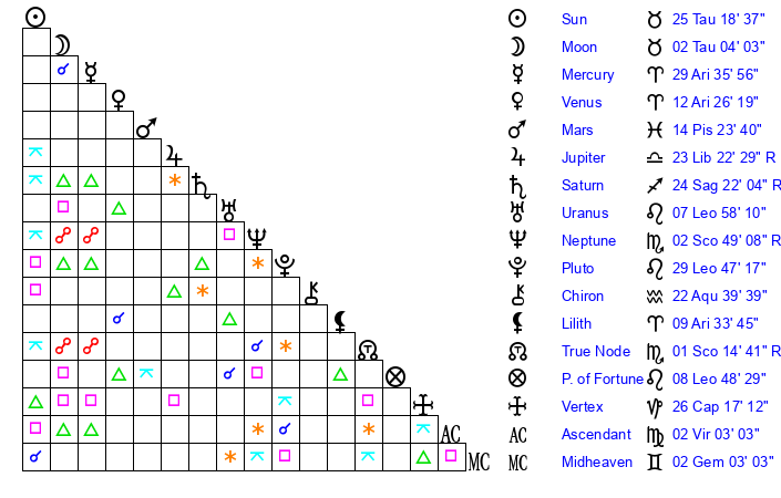 | Mars | 14 Pisces 25 | 13 Leo 9 | 0 Taurus 55 |