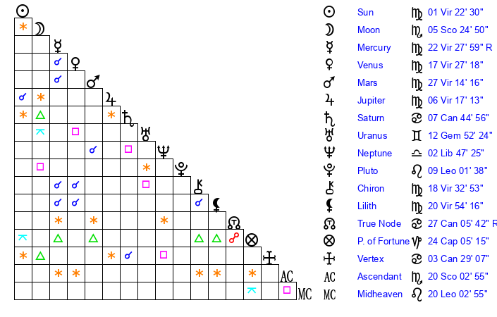 | Sun | 1 Virgo 23 | 1 Virgo 47 | 21 Scorpio 12 |