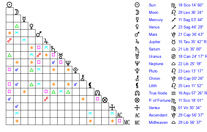 | Sun | 18 Scorpio 15 | 18 Scorpio 33 | 2 Aquarius 24 |