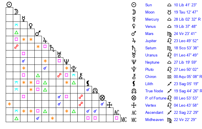 | Neptune | 27 Libra 20 | 0 Aries 26 | 29 Libra 44 |
