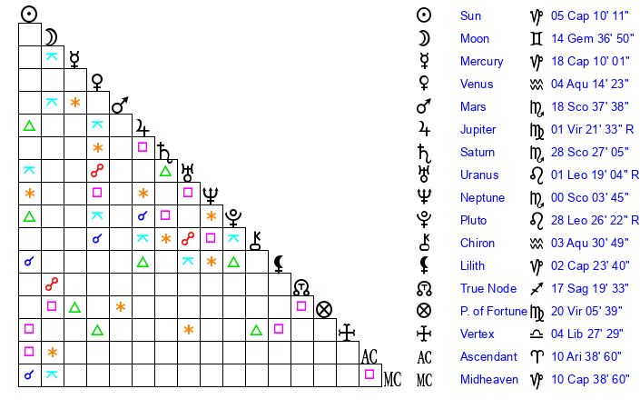 | Mercury | 18 Capricorn 10 | 14 Sagittarius 38 | 21 Aquarius 34 |