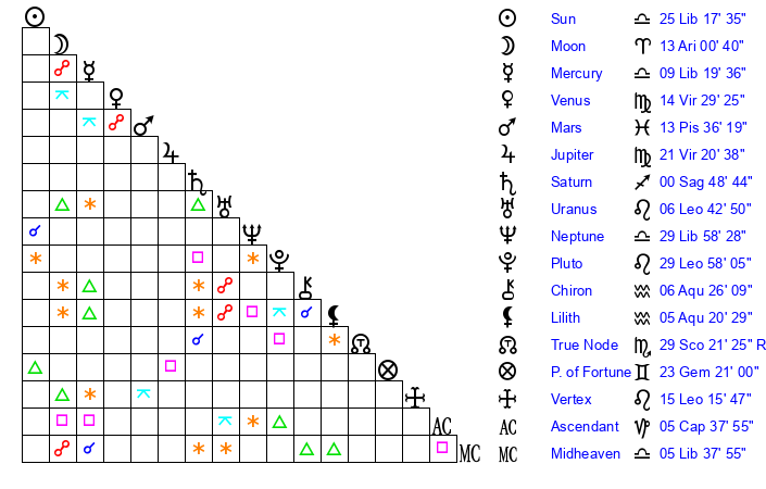 | Sun | 25 Libra 17 | 25 Libra 34 | 4 Capricorn 55 |