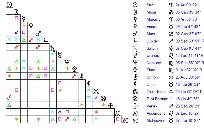 | Sun | 24 Aries 0 | 25 Aries 0 | 27 Gemini 39 |