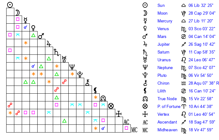 | Mercury | 27 Libra 12 | 19 Libra 7 | 24 Scorpio 9 |
