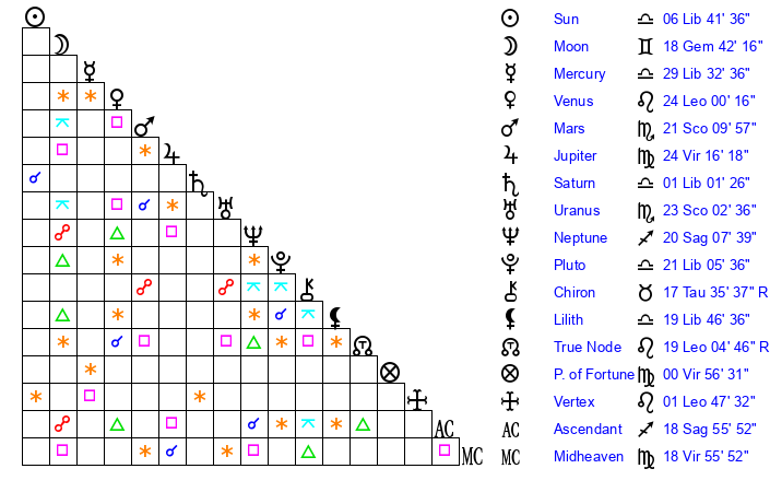 | Uranus | 23 Scorpio 6 | 1 Gemini 15 | 25 Scorpio 39 |