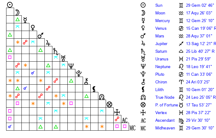 | Moon | 17 Aquarius 25 | 24 Aries 37 | 17 Libra 30 |