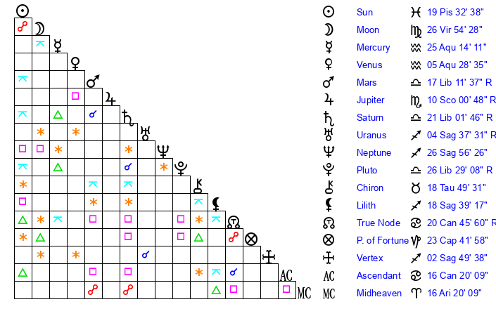| Neptune | 26 Sagittarius 57 | 29 Pisces 14 | 26 Sagittarius 54 |