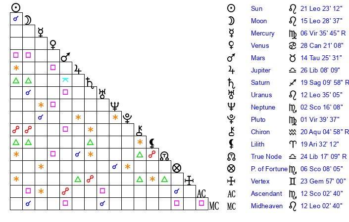 | Uranus | 12 Leo 36 | 1 Gemini 16 | 15 Leo 54 |