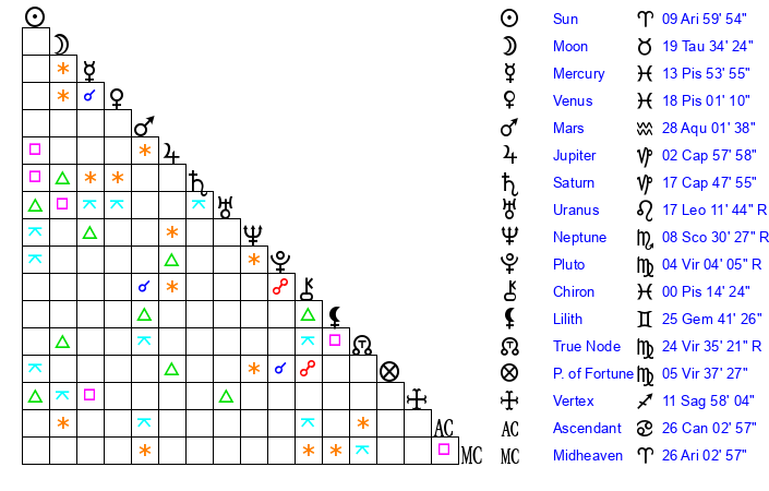 | Mercury | 13 Pisces 53 | 29 Pisces 34 | 1 Cancer 30 |