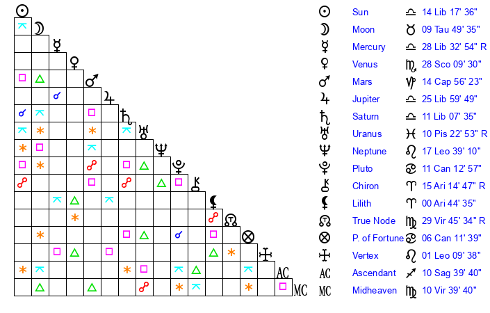 | Moon | 9 Taurus 54 | 2 Taurus 11 | 24 Aquarius 48 |