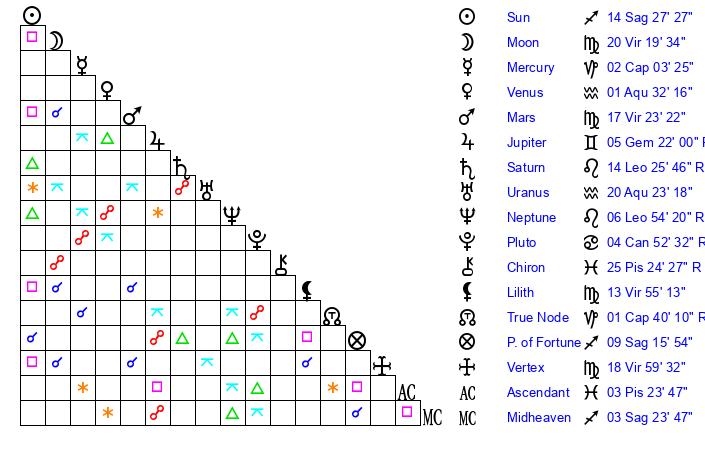 | Moon | 20 Virgo 18 | 26 Aquarius 14 | 24 Leo 18 |